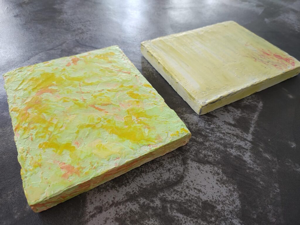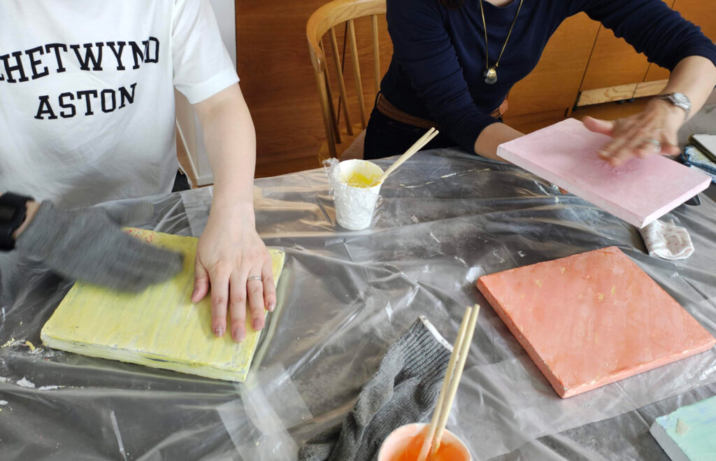 自宅をご覧いただいたあと、せっかくなので余っていた板で左官体験。